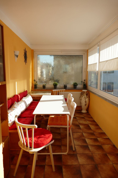 Der geschlossene Balkon im OG ist beheizt und kann von allen Bewohnern genutzt werden, ebenso steht die große Terrasse allen zur Verfügung.