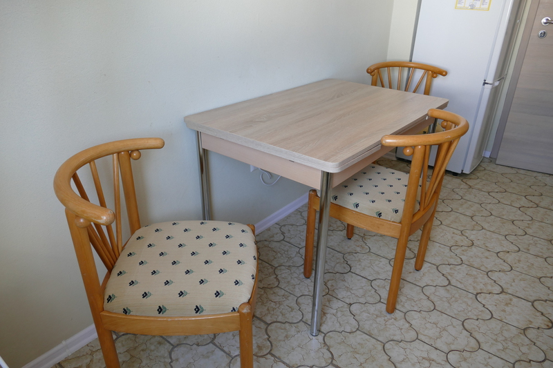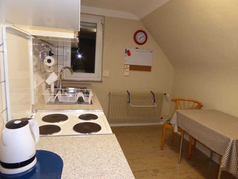 Auch die Küche im Dachgeschoss ist funktionell ausgestattet (hat aber keine Spülmaschine), einen Standherd und einen Kühlschrank mit Tiefkühlfach.